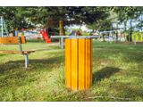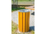 The litter bin is made from spruce wood. The wood is impregnated and coated with a layer of lacquer. The structure is fixed in a concrete bed. The trash can insert is made of galvanized steel. All other metallic elements are also zinc coated or duplex powder coated with coat curing according to RAL to prevent corrosion. All fastening material is galvanized or stainless steel.
