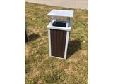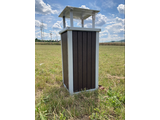 The litter bin is made from spruce wood. The wood is impregnated and coated with a layer of lacquer. The structure is fixed in a concrete bed. The trash can insert is made of galvanized steel. All other metallic elements are also zinc coated or duplex powder coated with coat curing according to RAL to prevent corrosion. All fastening material is galvanized or stainless steel.