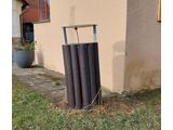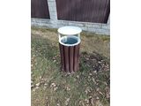 The litter bin is made from spruce wood. The wood is impregnated and coated with a layer of lacquer. The structure is fixed in a concrete bed. The trash can insert is made of galvanized steel. All other metallic elements are also zinc coated or duplex powder coated with coat curing according to RAL to prevent corrosion. All fastening material is galvanized or stainless steel.