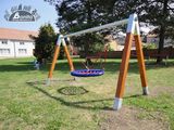 The swing's support structure is made from thick glued wooden supports. This solution ensures maximum protection against cracking, which is common for products made from solid wood. The wooden supports are impregnated and coated with a triple layer of lacquer, which meets the terms and conditions of the EN71/3 Standard (safe for children's toys). The structures are anchored into the ground in steel plates, which are protected against corrosion by hot-dip galvanizing a and fixed in a concrete bed. The anchors are fastened to the play unit with bolts and their structure ensures that they are not in direct contact with the ground.