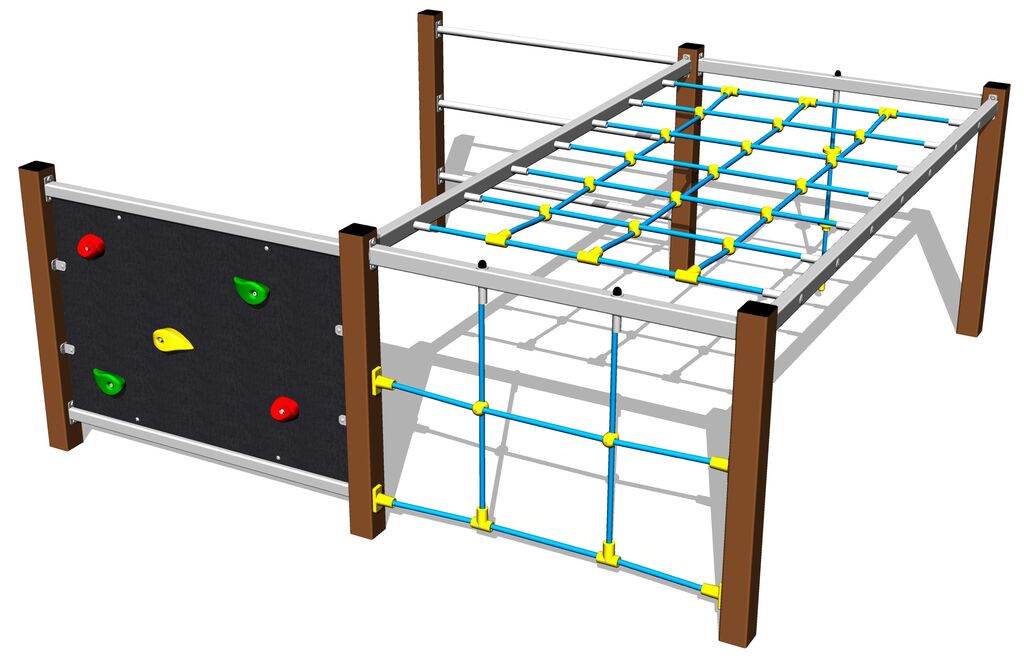 The climbing net is made using HERKULES material (16 mm thick ropes made from polypropylene with a steel internal core) and it is connected with plastic joints. The climbing wall is made from HPL (High-pressure laminate, which is characterised by high colour stability, UV resistance and water resistance). The climbing holds are made from the polyester, which ensures long life, colour preservation as well as skin friendly surface. All fastening material is galvanized or stainless steel.
