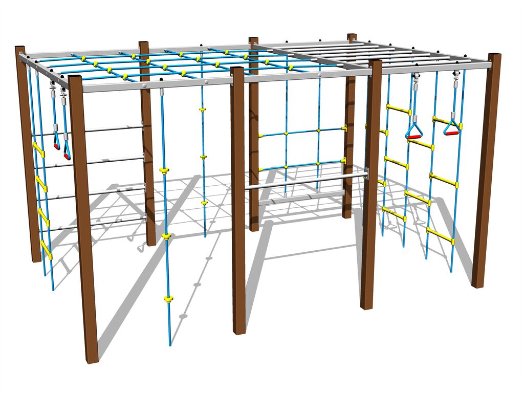 The climbing net, the horizontal climbing net, the climbing rope and the rope ladder are made using HERKULES material (16 mm thick ropes made from polypropylene with a steel internal core) and they are connected with plastic joints. The ropes are connected with plastic joints. All fastening material is galvanized or stainless steel.