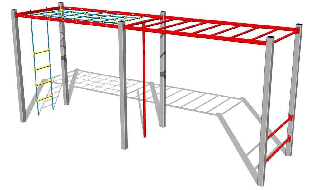 The climbing net and the rope ladder are made using HERKULES material (16 mm thick ropes made from polypropylene with a steel internal core) and they are connected with plastic joints. All fastening material is galvanized or stainless steel.