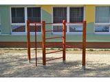 The climbing set support structure ismade from thick glued wooden supports. This solution ensures maximum protection against cracking, which is common for products made from solid wood. The wooden supports are impregnated and coated with a triple layer of lacquer, which meets the terms and conditions of the EN71/3 Standard (safe for children's toys). The structures are anchored into the ground in steel plates, which are protected against corrosion by hot-dip galvanizing and fixed in a concrete bed. The anchors are fastened to the play unit with bolts and their structure ensures that they are not in direct contact with the ground. All other metal units are zinc coated or duplex powder coated with coat curing according to RAL to prevent corrosion. All fastening material is galvanized or stainless steel.