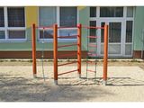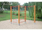 The climbing set support structure ismade from thick glued wooden supports. This solution ensures maximum protection against cracking, which is common for products made from solid wood. The wooden supports are impregnated and coated with a triple layer of lacquer, which meets the terms and conditions of the EN71/3 Standard (safe for children's toys). The structures are anchored into the ground in steel plates, which are protected against corrosion by hot-dip galvanizing and fixed in a concrete bed. The anchors are fastened to the play unit with bolts and their structure ensures that they are not in direct contact with the ground. All other metal units are zinc coated or duplex powder coated with coat curing according to RAL to prevent corrosion.