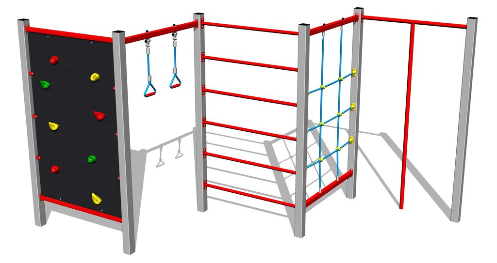 Climbing wall, 2x swinging rope loop, Swedish ladder, climbing net, climbing pole. More information
