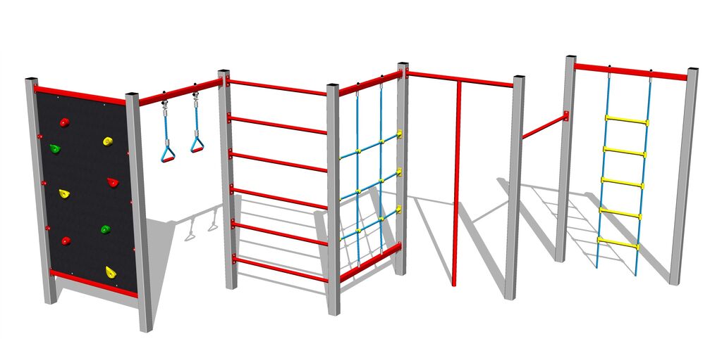 Fitness rack, climbing wall, 2x swinging rope loop, Swedish ladder, climbing net, climbing pole, rope ladder. More information