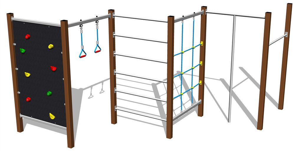 Fitness rack, climbing wall, 2x swinging rope loop, Swedish ladder, climbing net, climbing pole. More information