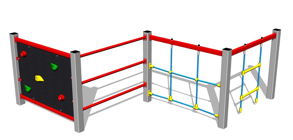 The climbing net is made using HERKULES material (16 mm thick ropes made from polypropylene with a steel internal core) and it is connected with plastic joints. The climbing wall is made from HPL (High-pressure laminate, which is characterised by high colour stability, UV resistance and water resistance). The climbing holds are made from the polyester, which ensures long life, colour preservation as well as skin friendly surface. All fastening material is galvanized or stainless steel.