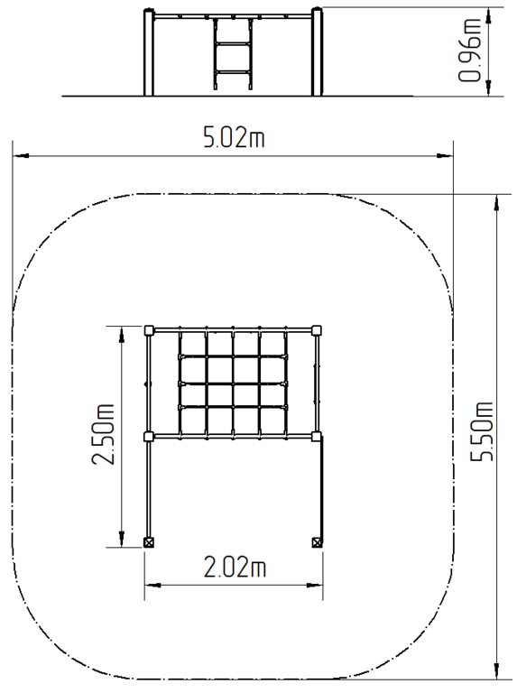 The support structure of the climbing set is made from structural steel, it is zinc coated which significantly prolongs the life of the play unit or duplex powder coated with coat curing according to RAL to prevent corrosion and it is fixed in a concrete bed. All other metallic elements are also zinc coated or duplex powder coated with coat curing according to RAL to prevent corrosion..