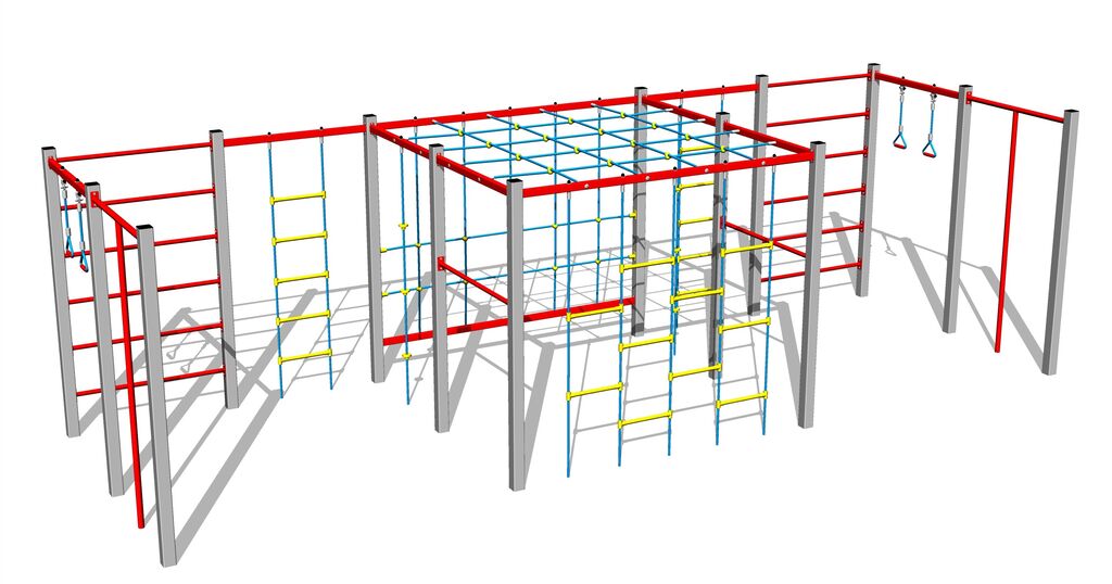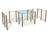 The climbing net, the horizontal climbing net, the climbing rope and the rope ladder are made using HERKULES material (16 mm thick ropes made from polypropylene with a steel internal core) and they are connected with plastic joints. The ropes are connected with plastic joints. All fastening material is galvanized or stainless steel.