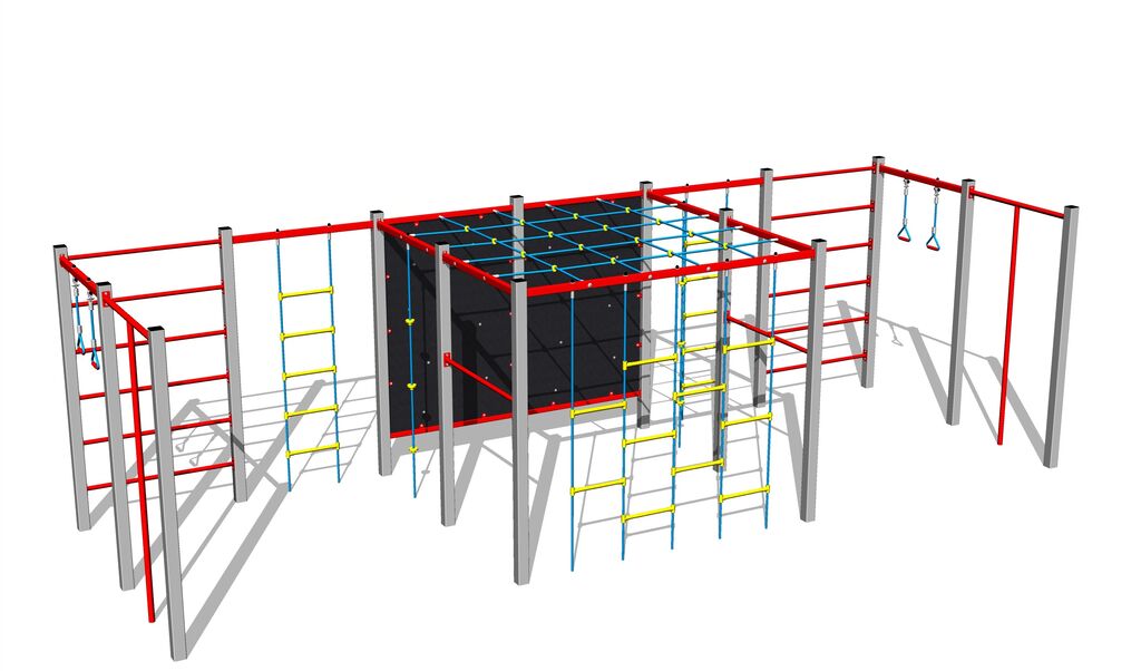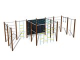 The climbing net, the horizontal climbing net, the climbing rope and the rope ladder are made using HERKULES material (16 mm thick ropes made from polypropylene with a steel internal core) and they are connected with plastic joints. The climbing wall is made from HPL (High-pressure laminate, which is characterised by high colour stability, UV resistance and water resistance). The climbing holds are made from the polyester, which ensures long life, colour preservation as well as skin friendly surface. All fastening material is galvanized or stainless steel.