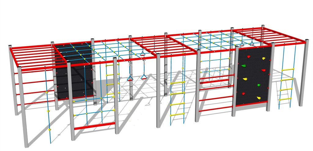 The climbing net, the horizontal climbing net, the climbing rope and the rope ladder are made using HERKULES material (16 mm thick ropes made from polypropylene with a steel internal core) and they are connected with plastic joints. The climbing wall is made from HPL (High-pressure laminate, which is characterised by high colour stability, UV resistance and water resistance). The climbing holds are made from the polyester, which ensures long life, colour preservation as well as skin friendly surface. All fastening material is galvanized or stainless steel.