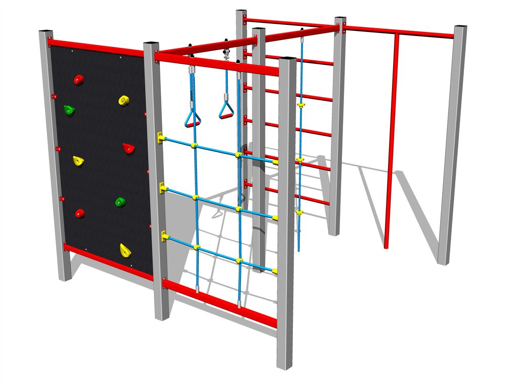 The climbing net, the horizontal climbing net, the climbing rope and the rope ladder are made using HERKULES material (16 mm thick ropes made from polypropylene with a steel internal core) and they are connected with plastic joints. The climbing wall is made from HPL (High-pressure laminate, which is characterised by high colour stability, UV resistance and water resistance). The climbing holds are made from the polyester, which ensures long life, colour preservation as well as skin friendly surface. All fastening material is galvanized or stainless steel.