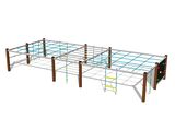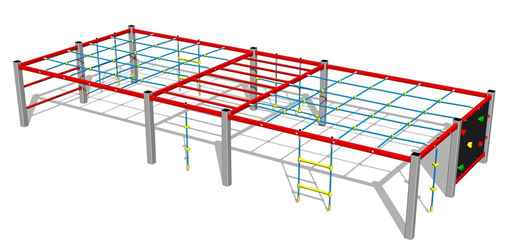 The climbing net, the horizontal climbing net, the climbing rope and the rope ladder are made using HERKULES material (16 mm thick ropes made from polypropylene with a steel internal core) and they are connected with plastic joints. The climbing wall is made from HPL (High-pressure laminate, which is characterised by high colour stability, UV resistance and water resistance). The climbing holds are made from the polyester, which ensures long life, colour preservation as well as skin friendly surface. All fastening material is galvanized or stainless steel.