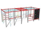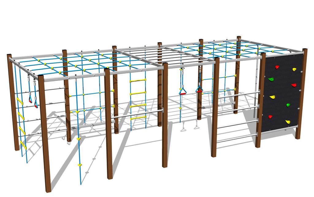 The climbing net, the horizontal climbing net, the climbing rope and the rope ladder are made using HERKULES material (16 mm thick ropes made from polypropylene with a steel internal core) and they are connected with plastic joints. The climbing wall is made from HPL (High-pressure laminate, which is characterised by high colour stability, UV resistance and water resistance). The climbing holds are made from the polyester, which ensures long life, colour preservation as well as skin friendly surface. All fastening material is galvanized or stainless steel.