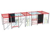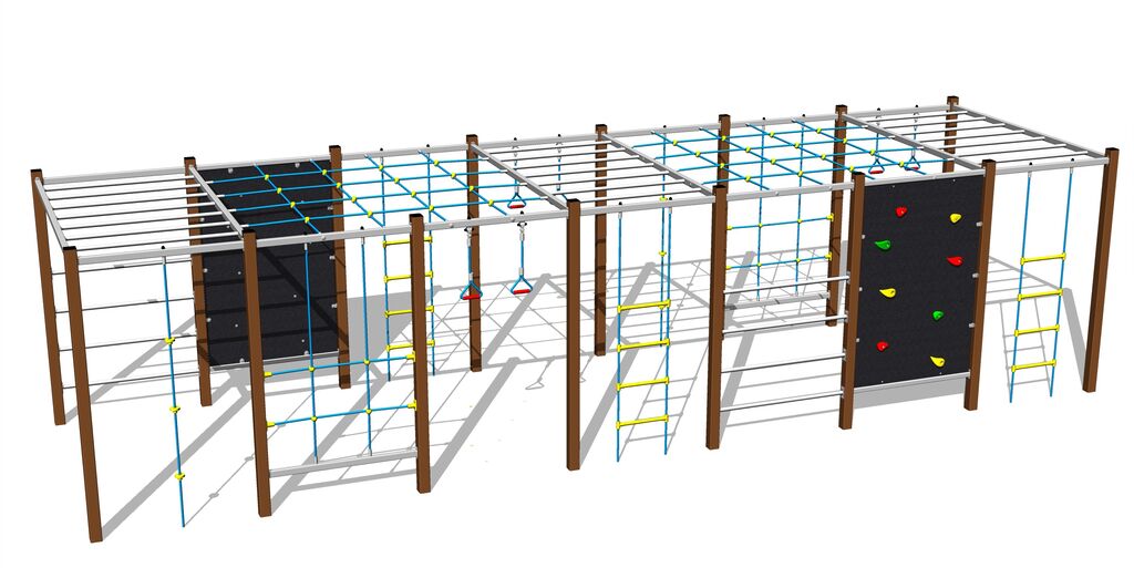 The climbing net, the horizontal climbing net, the climbing rope and the rope ladder are made using HERKULES material (16 mm thick ropes made from polypropylene with a steel internal core) and they are connected with plastic joints. The climbing wall is made from HPL (High-pressure laminate, which is characterised by high colour stability, UV resistance and water resistance). The climbing holds are made from the polyester, which ensures long life, colour preservation as well as skin friendly surface. All fastening material is galvanized or stainless steel.