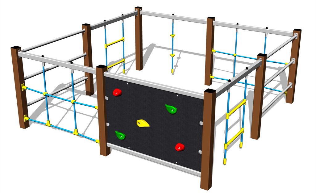 The climbing net, the horizontal climbing net, the climbing rope and the rope ladder are made using HERKULES material (16 mm thick ropes made from polypropylene with a steel internal core) and they are connected with plastic joints. The climbing wall is made from HPL (High-pressure laminate, which is characterised by high colour stability, UV resistance and water resistance). The climbing holds are made from the polyester, which ensures long life, colour preservation as well as skin friendly surface. All fastening material is galvanized or stainless steel.