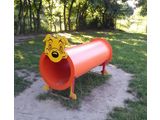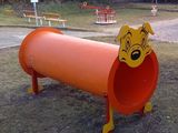 Head and legs of the dog are made of high quality HDPE plastic (high density coloured polyethylene, which is characterised by high colour stability, UV resistance but mainly safety as it doesn't break and therefore there is no danger of injury to children by sharp fragments). Crawl tunnel is made from fibreglass which is UV stable and it is characterised by high colour stability. All fastening material is galvanized or stainless steel.