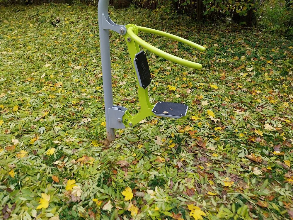 Seat and backrest are made of aluminum and covered with HDPE polyethylene (high-pressure, full-colored polyethylene, which is characterized by high color stability, UV resistance). The handles are made of powder-coated steel tubes. The supporting column is made of a steel tube with a mounting flange at the bottom. The seat frame and tread are made of powder coated sheet metal. Rolling bearings are used for movable connections. Holes are sealed with steel elements at the ends. All fasteners are stainless.