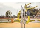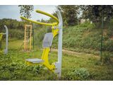 Seat and backrest are made of aluminum and covered with HDPE polyethylene (high-pressure, full-colored polyethylene, which is characterized by high color stability, UV resistance). The handles are made of powder-coated steel tubes. The supporting column is made of a steel tube with a mounting flange at the bottom. The seat frame and tread are made of powder coated sheet metal. Rolling bearings are used for movable connections. Holes are sealed with steel elements at the ends. All fasteners are stainless.