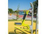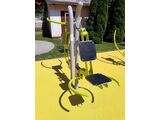 Seat and backrest are made of aluminum and covered with HDPE polyethylene (high-pressure, full-colored polyethylene, which is characterized by high color stability, UV resistance). The handles are made of powder-coated steel tubes. The supporting column is made of a steel tube with a mounting flange at the bottom. The seat frame and tread are made of powder coated sheet metal. Rolling bearings are used for movable connections. Holes are sealed with steel elements at the ends. All fasteners are stainless.