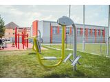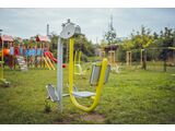 Seat and backrest are made of aluminum and covered with HDPE polyethylene (high-pressure, full-colored polyethylene, which is characterized by high color stability, UV resistance). The handles are made of powder-coated steel tubes. The supporting column is made of a steel tube with a mounting flange at the bottom. The seat frame and tread are made of powder coated sheet metal. Rolling bearings are used for movable connections. Holes are sealed with steel elements at the ends. All fasteners are stainless.