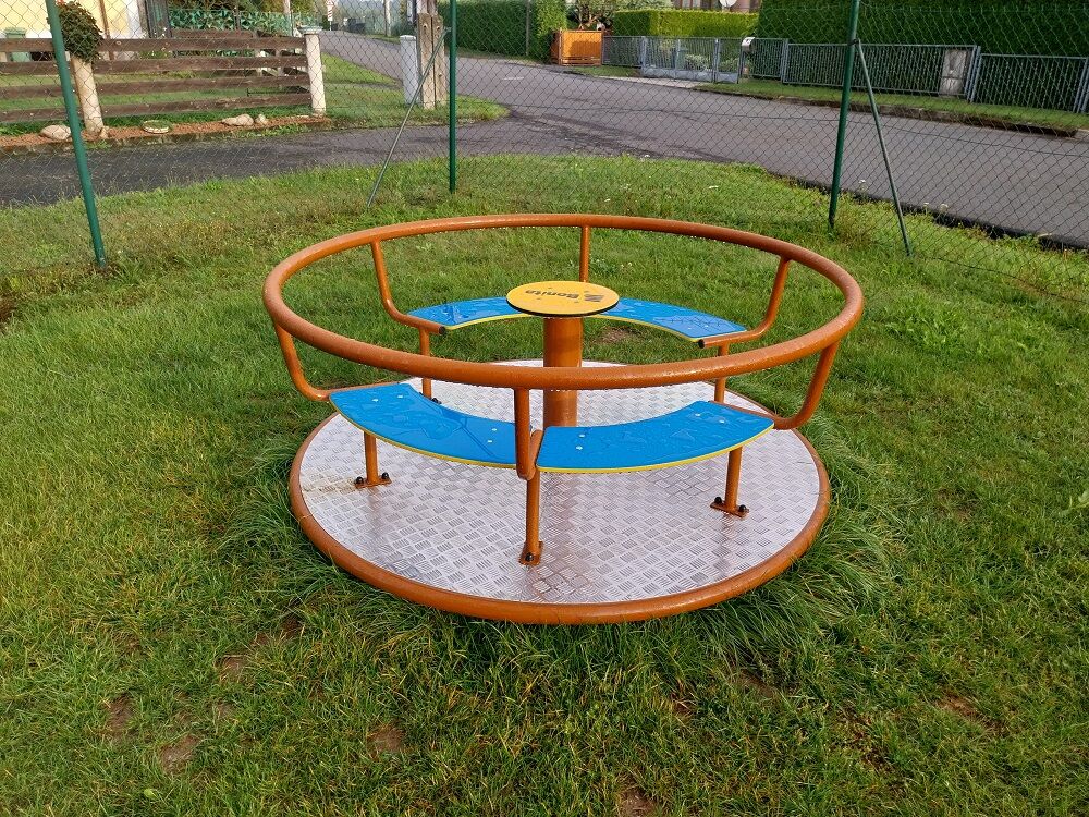 The merry-go-round is welded from steel pipes and square profiles. All metal units are protected against corrosion by zinc coating, resulting in a very prolonged service life of the workout elements or duplex powder coated with coat curing according to RAL to prevent corrosion. The structures are fixed in a concrete bed. The merry-go-round is constructed with durability and long life in mind. The rotation hub and the seats are made from high quality HDPE plastic (high density coloured polyethylene, which is characterised by high colour stability, UV resistance but mainly safety as it doesn't break and therefore there is no danger of injury to children by sharp fragments) The platform is made from a non-slip sheet metal. All fastening material is galvanized or stainless steel.