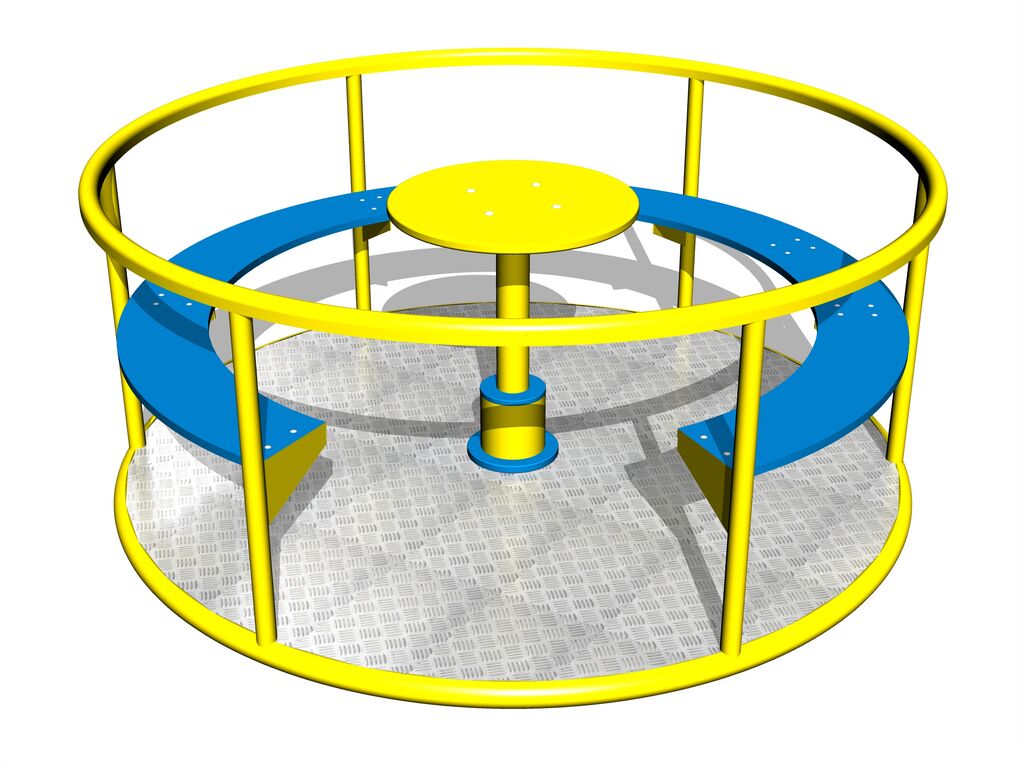 The merry-go-round is welded from steel pipes and square profiles. All metal units are protected against corrosion by zinc coating, resulting in a very prolonged service life of the workout elements or duplex powder coated with coat curing according to RAL to prevent corrosion. The structures are fixed in a concrete bed. The merry-go-round is constructed with durability and long life in mind. The rotation hub and the seats are made from high quality HDPE plastic (high density coloured polyethylene, which is characterised by high colour stability, UV resistance but mainly safety as it doesn't break and therefore there is no danger of injury to children by sharp fragments) The platform is made from a non-slip sheet metal. All fastening material is galvanized or stainless steel.