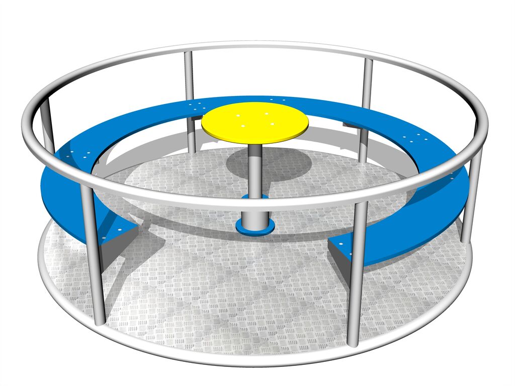 The merry-go-round is welded from steel pipes and square profiles. All metal units are protected against corrosion by zinc coating, resulting in a very prolonged service life of the workout elements or duplex powder coated with coat curing according to RAL to prevent corrosion. The structures are fixed in a concrete bed. The merry-go-round is constructed with durability and long life in mind. The rotation hub and the seats are made from high quality HDPE plastic (high density coloured polyethylene, which is characterised by high colour stability, UV resistance but mainly safety as it doesn't break and therefore there is no danger of injury to children by sharp fragments) The platform is made from a non-slip sheet metal. All fastening material is galvanized or stainless steel.