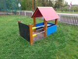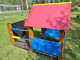 The benches, side walls and table are made from high quality HDPE plastic (high density coloured polyethylene, which is characterised by high colour stability, UV resistance but mainly safety as it doesn't break and therefore there is no danger of injury to children by sharp fragments). The roof is made from HPL (High-pressure laminate, which is characterised by high colour stability, UV resistance and water resistance). The drawing area and floor are made from water-proof plywood, which is designed for external use. All fastening material is galvanized or stainless steel.