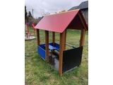 The benches, side walls and table are made from high quality HDPE plastic (high density coloured polyethylene, which is characterised by high colour stability, UV resistance but mainly safety as it doesn't break and therefore there is no danger of injury to children by sharp fragments). The roof is made from HPL (High-pressure laminate, which is characterised by high colour stability, UV resistance and water resistance). The drawing area and floor are made from water-proof plywood, which is designed for external use. All fastening material is galvanized or stainless steel.