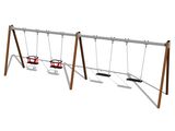 The support structure of the swing is made from structural steel, which is zinc coated or duplex powder coated with coat curing according to RAL to prevent corrosion and is fixed in a concrete bed. The Baby seat is made of rubber and is reinforced with an aluminum insert. The Normal seat is made of aluminum, covered with a soft and comfortable rubber. The chains are stainless steel, resulting in a very prolonged service life of the product. All fastening material is galvanized or stainless steel.