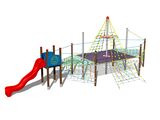 The support structures of the rope unit are made from structural steel with a diameter of 108 mm (support pillar with a diameter of 159 mm), they are zinc coated or duplex powder coated with coat curing according to RAL to prevent corrosion and fixed in a concrete bed. The tower support structures are made from structural steel. The ropes are made using HERKULES material (16 mm thick ropes made from polypropylene with a steel internal core) and are connected with plastic joints. The slide is made from fibreglass. The surface on the slide is made from high quality HDPE plastic (high density coloured polyethylene, which is characterised by high colour stability, UV resistance but mainly safety as it doesn't break and therefore there is no danger of injury to children by sharp fragments). The platform is made from water-proof plywood or from HDPE should the client require. All fastening material is galvanized or stainless steel.