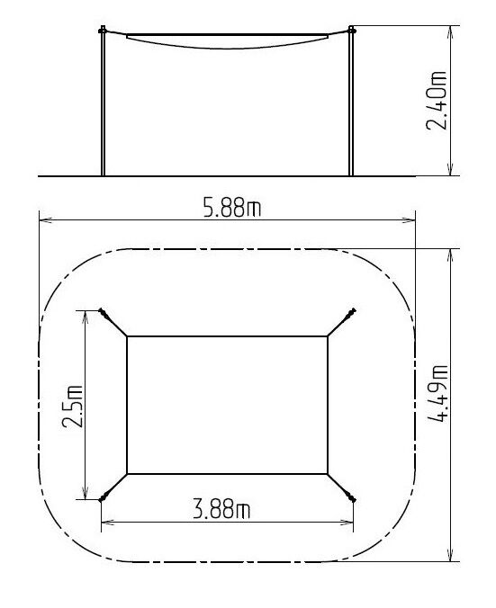 The supporting structure of the sandbox shading is made of structural steel, which is protected against corrosion by hot-dip galvanizing, which results in a very significant extension of the life of the gaming element. This construction is embedded in a concrete bed. The sandbox shade iis made from rubber coated polyester mesh, which is UV resistant. The sandbox shading is water permeable. All fasteners are galvanized or stainless steel.