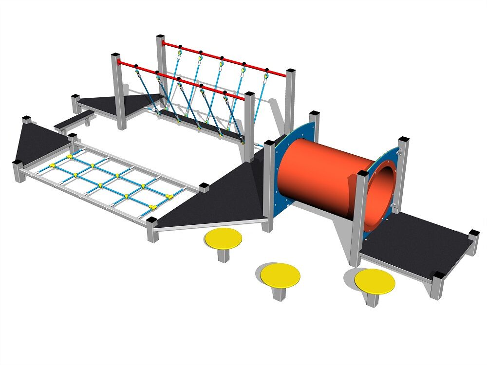 The support structure of the steps is made of structural steel which is protected against corrosion by zinc coating, resulting in a very prolonged service life of the workout elements or duplex powder coated with coat curing according to RAL to prevent corrosion. These structures are embedded in a concrete base. All other metallic elements are also zinc coated or duplex powder coated with coat curing according to RAL to prevent corrosion. Ropes and nets are made of HERKULES (16 mm polypropylene ropes with inner steel core) and are connected by plastic connectors. The crawler tunnel is made of polyethylene with high UV stability and high colour stability. All step boards are made of high quality HDPE (high-pressure, full-coloured polyethylene, which is characterised by high colour stability, UV resistance and mainly safety because it is rigid and there is no risk of injury caused by sharp broken fragments). The platforms are made from HPL (High-pressure laminate, which is characterised by high colour stability and water resistance). All connecting material is zinc or stainless steel coated.