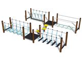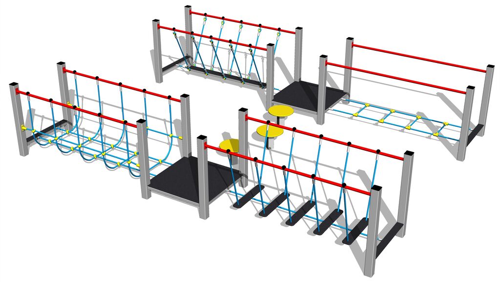 The support structure of the skill path is made from structural steel, it is zinc coated or duplex powder coated with coat curing according to RAL to prevent corrosion. The structure is fixed in a concrete bed. All other metal units are zinc coated or duplex powder coated with coat curing according to RAL to prevent corrosion. The ropes and nets are made using HERKULES material (16 mm thick ropes made from polypropylene with a steel internal core). The platforms are made from HPL (High-pressure laminate, which is characterised by high colour stability and water resistance). Steps boards are made of HPL (High-pressure laminate, which is characterised by high colour stability and water resistance). All step boards are made of high quality HDPE (high-pressure, full-coloured polyethylene, which is characterised by high colour stability, UV resistance and mainly safety because it is rigid and there is no risk of injury caused by sharp broken fragments). All fastening material is galvanized or stainless steel.