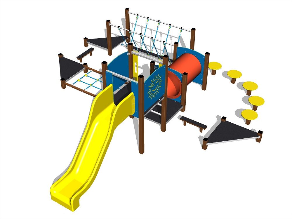 The slide is made from fibreglass. The surface of the slide is made from high quality HDPE plastic (high density coloured polyethylene, which is characterised by high colour stability, UV resistance but mainly safety as it doesn't break and therefore there is no danger of injury to children by sharp fragments). Ropes and nets are made of HERKULES (16 mm polypropylene ropes with inner steel core) and are connected by plastic connectors. The crawler tunnel is made of polyethylene with high UV stability and high colour stability. All step boards are made of high quality HDPE (high-pressure, full-coloured polyethylene, which is characterised by high colour stability, UV resistance and mainly safety because it is rigid and there is no risk of injury caused by sharp broken fragments). The platforms are made from HPL (High-pressure laminate, which is characterised by high colour stability and water resistance). All connecting material is zinc or stainless steel coated.