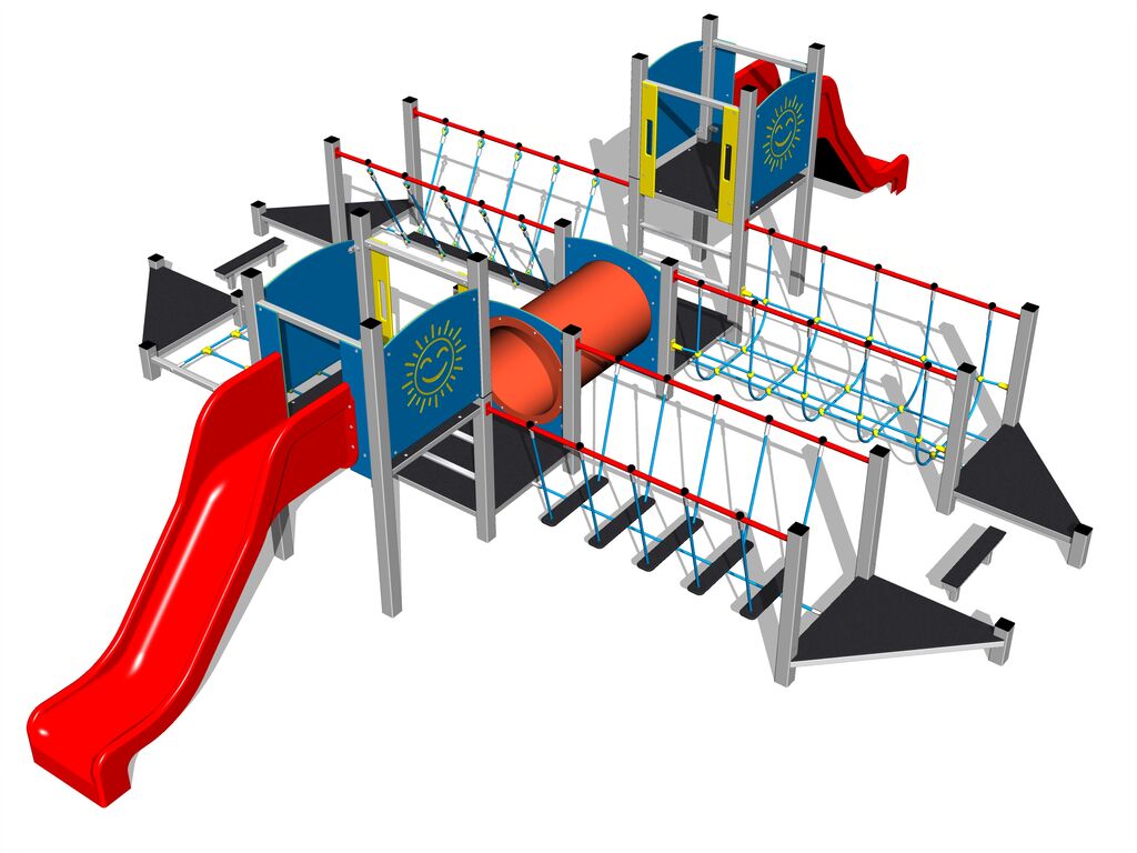 The slide is made from fibreglass. The surface of the slide is made from high quality HDPE plastic (high density coloured polyethylene, which is characterised by high colour stability, UV resistance but mainly safety as it doesn't break and therefore there is no danger of injury to children by sharp fragments). Ropes and nets are made of HERKULES (16 mm polypropylene ropes with inner steel core) and are connected by plastic connectors. The crawler tunnel is made of polyethylene with high UV stability and high colour stability. The platforms are made from HPL (High-pressure laminate, which is characterised by high colour stability and water resistance). All connecting material is zinc or stainless steel coated.