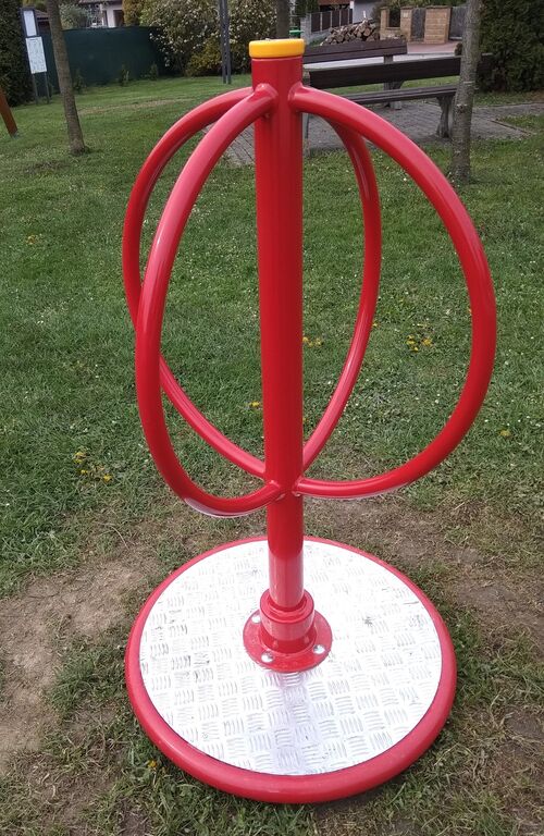 The merry-go-round is welded from steel pipes and square profiles. All metal units are protected against corrosion by zinc coating, resulting in a very prolonged service life of the workout elements or duplex powder coated with coat curing according to RAL to prevent corrosion. The structures are fixed in a concrete bed. The roundabout is constructed with durability and long life in mind. The platform is made from a non-slip sheet metal. All fastening material is galvanized or stainless steel.