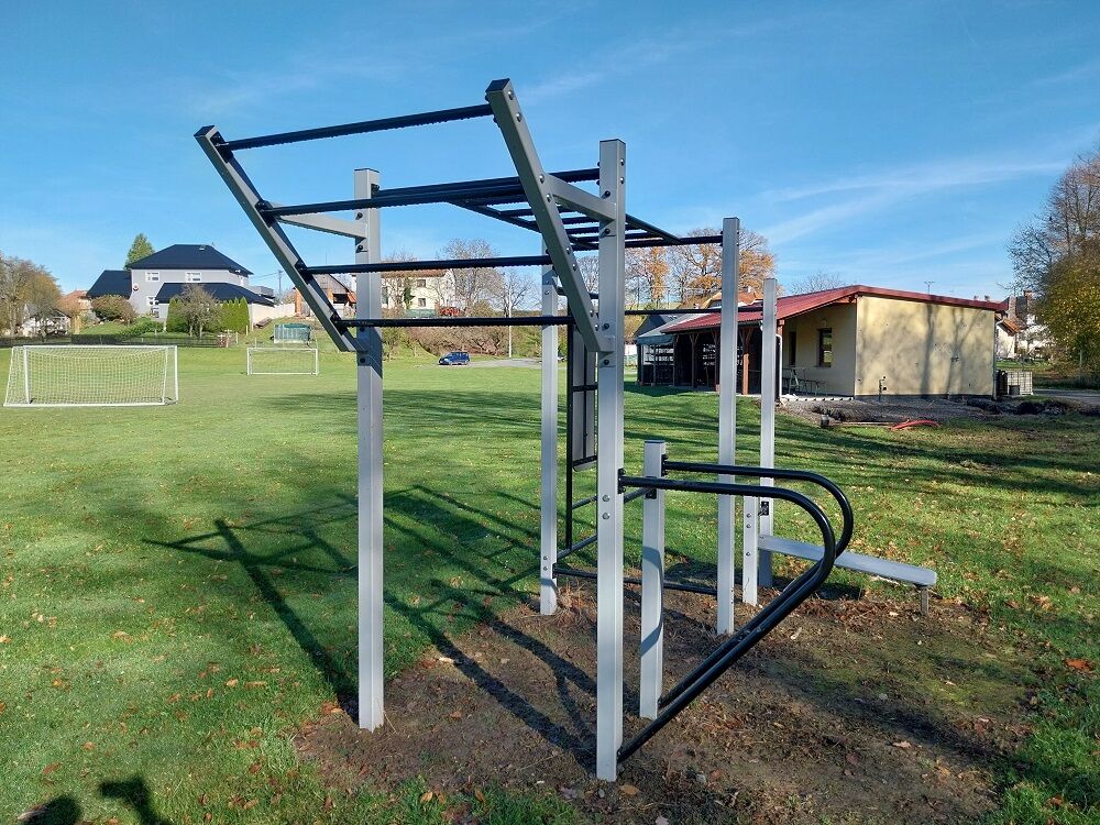 Street workout set WS8016K - there is no need for a fall zone up to the height of 1 m, a grass surface is enough. We offer six color variants of the support structure - red, blue, yellow, green, grey and orange. Handles are black or we offer the option of stainless steel for extra charge - price on request. More information