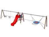 Triple chain swing Nest with slide RH6381K - with a landing and a metal, galvanized boom, drop height 1 m, a lawn is sufficient for the impact surface. 1 seat "nest" (diameter 1 m), 2x Seat Normal. There are four color variations available - red, green, blue and yellow. More information