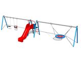 Triple chain swing Nest with slide RH6382K - with a landing and a metal, galvanized boom, drop height 1 m, a lawn is sufficient for the impact surface. 1 seat "nest" (diameter 1 m), 1x Seat Baby, 1x Seat Normal. There are four color variations available - red, green, blue and yellow. More information