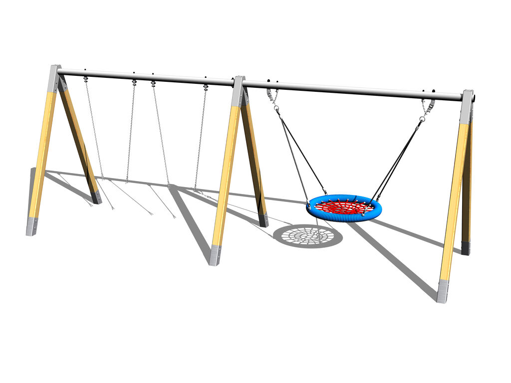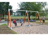 The swing's support structure is made from thick glued wooden supports. This solution ensures maximum protection against cracking, which is common for products made from solid wood. The wooden supports are impregnated and coated with a triple layer of lacquer, which meets the terms and conditions of the EN71/3 Standard (safe for children's toys). The structures are anchored into the ground in steel plates, which are protected against corrosion by hot-dip galvanizing a and fixed in a concrete bed. The anchors are fastened to the play unit with bolts and their structure ensures that they are not in direct contact with the ground.