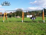 The swing's support structure is made from thick glued wooden supports. This solution ensures maximum protection against cracking, which is common for products made from solid wood. The wooden supports are impregnated and coated with a triple layer of lacquer, which meets the terms and conditions of the EN71/3 Standard (safe for children's toys). The structures are anchored into the ground in steel plates, which are protected against corrosion by hot-dip galvanizing a and fixed in a concrete bed. The anchors are fastened to the play unit with bolts and their structure ensures that they are not in direct contact with the ground.