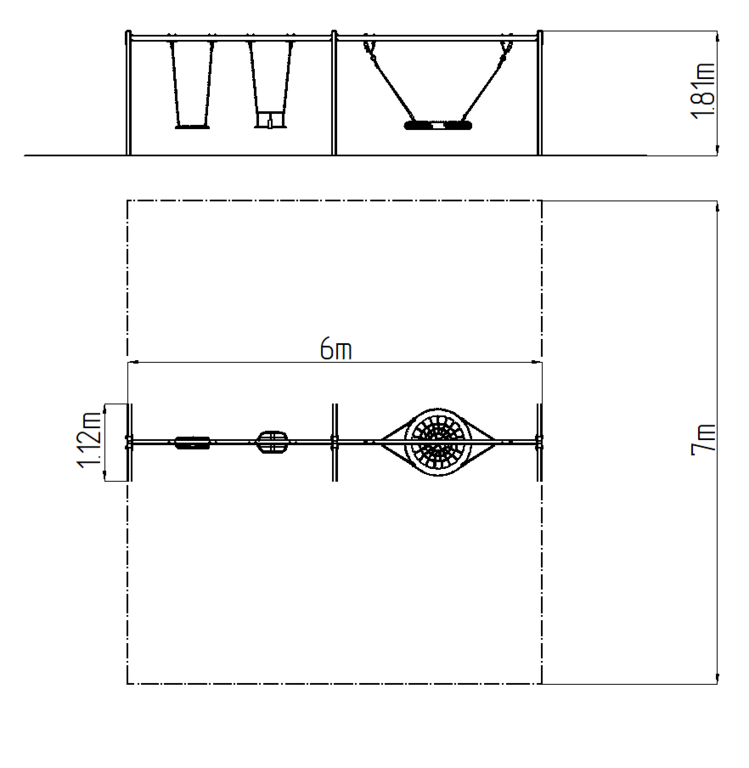 The swing is hung on a metal girder using galvanized chains. The "Bird's Nest" seat is made from polypropylene rope with heavy duty fibres. The hanging ropes are made using HERKULES material (16 mm thick ropes made from polypropylene with a steel internal core). The Normal seat is made of aluminum, covered with a soft and comfortable rubber. The Baby seat baby is made of rubber and is reinforced with an aluminum insert. All fastening material is galvanized or stainless steel.