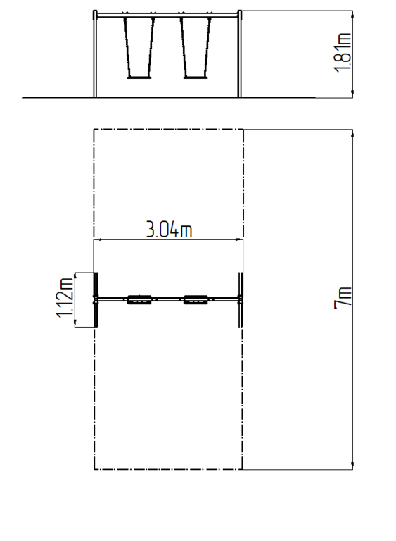 The support structure of the swing is made from structural steel, which is zinc coated or duplex powder coated with coat curing according to RAL to prevent corrosion and is fixed in a concrete bed. The Normal seat is made of aluminum, covered with a soft and comfortable rubber. The chains are stainless steel, resulting in a very prolonged service life of the product. All fastening material is galvanized or stainless steel.