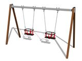 The support structure of the swing is made from structural steel, which is zinc coated or duplex powder coated with coat curing according to RAL to prevent corrosion and is fixed in a concrete bed. The Baby seat is made of rubber and is reinforced with an aluminum insert. The chains are stainless steel, resulting in a very prolonged service life of the product. All fastening material is galvanized or stainless steel.