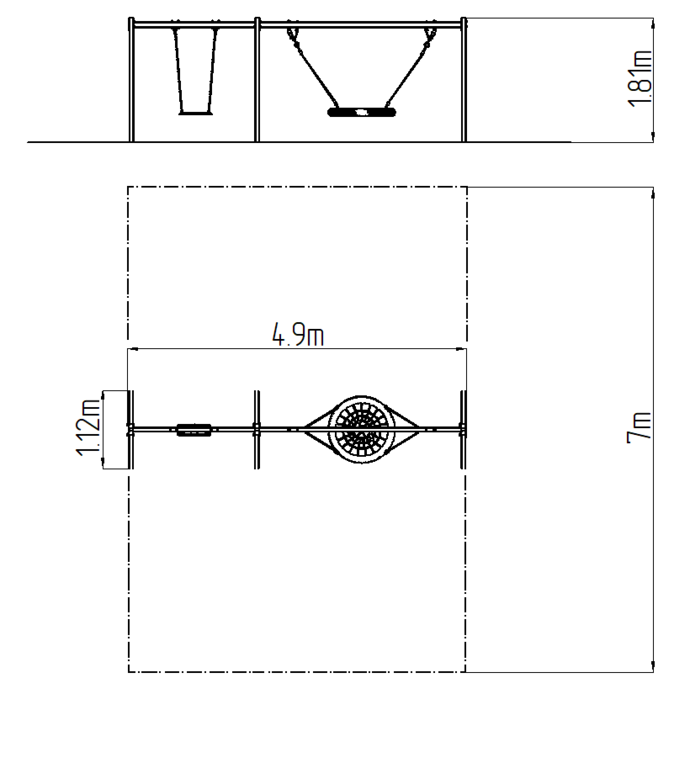 The swing is hung on a metal girder using galvanized chains. The "Bird's Nest" seat is made from polypropylene rope with heavy duty fibres. The hanging ropes are made using HERKULES material (16 mm thick ropes made from polypropylene with a steel internal core). The Normal seat is made of aluminum, covered with a soft and comfortable rubber. All fastening material is galvanized or stainless steel.