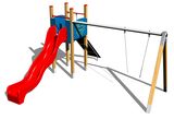 Seats and hinges are not part of the swing. It is necessary to buy a seat (1 pieces) of your choice and curtains (2 pieces). Tower, slide, 2x barrier, sloping ramp with the rope and HDPE steps, metal beam. More information